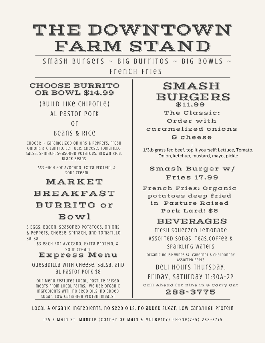 Open Thursday, Friday, and Saturday from 11:30 - 2:00, this menu is based around healthy delicious meals with no seed oils, no added sugar, and organic ingredients and local pasture raised meats! Our focus is on providing low-carb, high protein, nutrient dense foods for optimum health! 125 E Main St