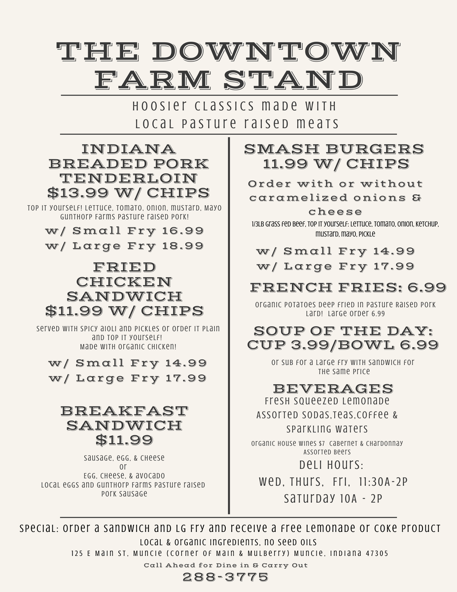 Open Wednesday, Thursday, Friday 11:30 - 2:00 and Saturday from 10 - 2, our menu is based around healthy delicious meals with no seed oils, organic ingredients and local pasture raised meats! Our focus is on providing Hoosier classics made with good local ingredients at 125 E Main St!